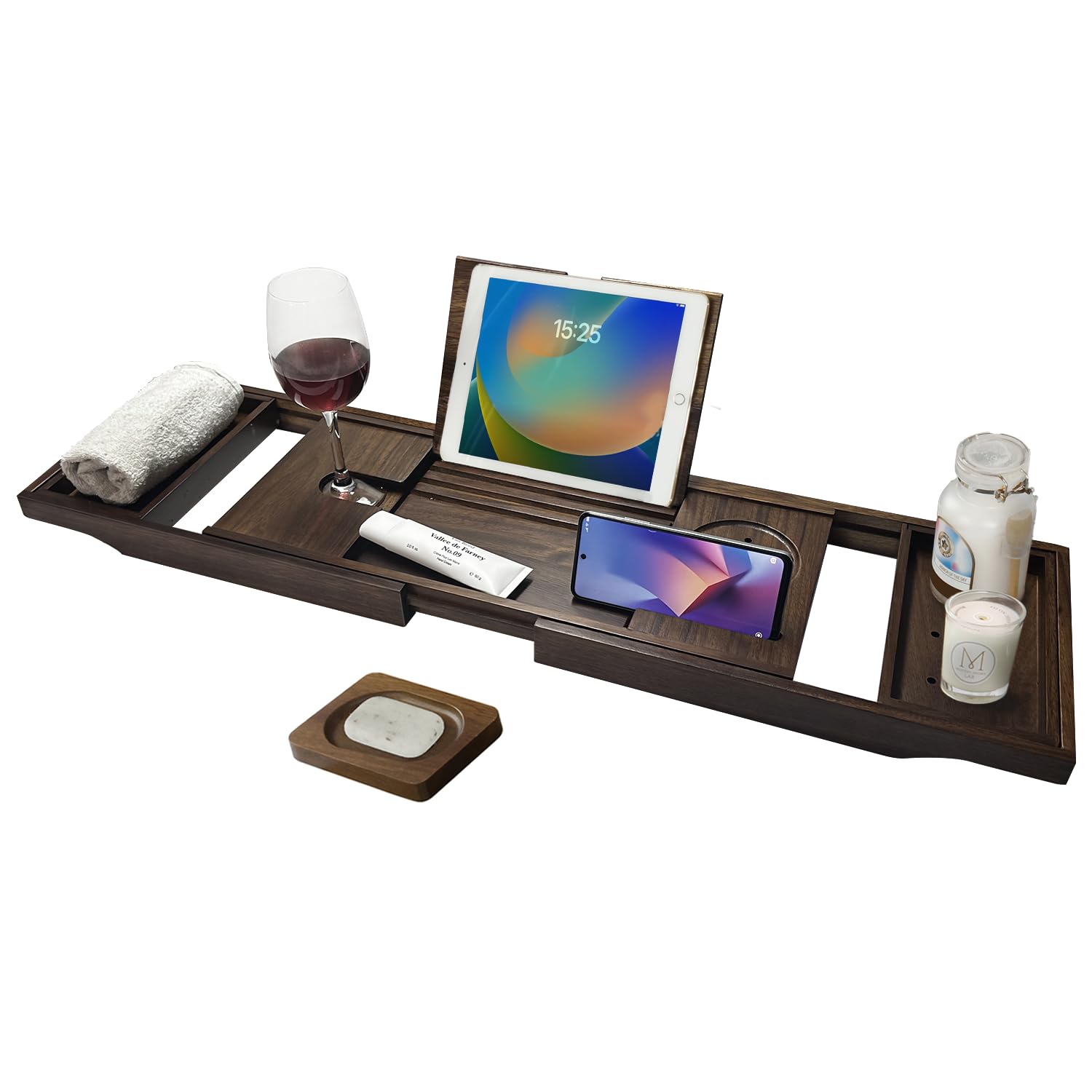 Its expandable design ensures a perfect fit for most tubs, while multi-functional compartments keep your essentials within reach — whether it's a book, glass of wine, or soap.